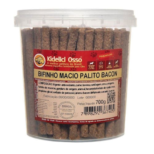 Alimento específico semi úmido para cãesRetribua o carinho que o seu cão lhe proporciona oferecendo-lhe kidelici osso que é sobremesa saudável, anti-estressante e de rápida aceitação pelo seu querido e fiel amigo.Petisco excelente para a saúde das gengivas, satisfaz a necessidade de mastigar, combate mau hálito e tártaro, limpa os dentes, baixa caloria.Contem em sua formula hidrolisado proteico de raspa de couro com proteína bruta de 79,36%, farinha de carne e osso com proteína bruta de 42%.Segundo "pinheiro et al 1989 ", farinha de origem animal, são as principais fontes proteicas utilizadas em rações, visto conter elevado teor de proteína bruta 79,36% .Segundo "lima 1985 , os valores de energia metabolizável e do coeficiente de digestibilidade da proteína bruta são de 3.287 kcal/kg e 80,13 %.Composição básica:Carne bovina, farinha de carne bovina, farinha de couro não hidrolisada, proteína texturizada de soja, antioxidante bht e bha, umectante, conservante, corante alimento.Níveis de garantia:Proteína bruta.............. min 25,0%Extrato etéreo............... min. 8,0%Umidade....................... máx. 30,0%Cálcio........................... máx. 2,0 %Cálcio........................... min. 0,06 %Fósforo......................... min 0,4%Mat. Mineral................. min 10,0%Mat. Fibrosa................. máx 3,0%Conservar local seco, fresco e arejado."uso proibido alimentação ruminante""este produto não substitui o alimento completo""produto isento de registro no ministério da agricultura, pecuária e abastecimento"Modo de usar: O petisco deve ser oferecido uma ou mais unidade por dia ao seu animal como prêmio ou demonstração de carinho.Após aberto consumir 10 dias para evitar perda aroma e sabor.