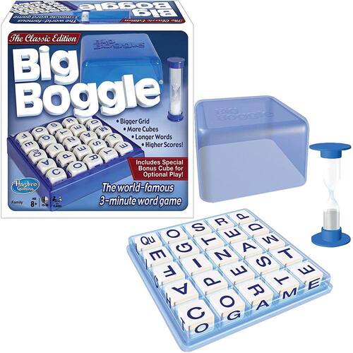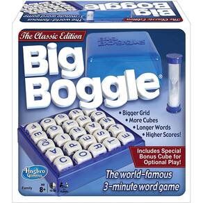 Boggle, o mundialmente famoso jogo de palavras de 3 minutos está agora disponível como "Big Boggle. O novo cubo "Double Letter" facilita a formação de palavras mais longas. Este jogo contém uma grade maior, mais cubos e permite pontuações mais altas. Para 2 ou mais jogadores.