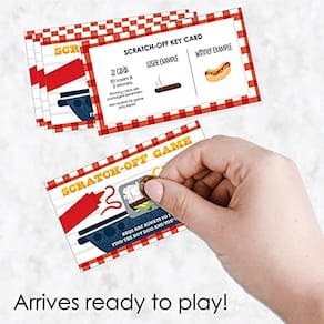 Experimente estas ideias do jogo Fire Up the Grill Party Scratch Off Cards: SIMPLES: Entregue uma carta de jogo raspada aos hóspedes quando eles chegarem. RÁPIDO: Defina uma carta de jogo raspada em cada ponto das mesas para que os convidados possam jogar enquanto desfrutam da refeição. FAVORITO: Distribua raspadinhas individuais como mini prêmios durante jogos mais longos, como bingo de presente. Faça com que todos arranhem ao mesmo tempo e os vencedores recebam um grande prêmio.