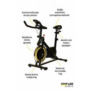 Bike spinning inercia 8 kg bicicleta ergometrica one life A bike spinning one life sports é o equipamento ideal para quem busca treinos intensos, silenciosos e personalizados, seja em casa ou na academia. Fabricada com estrutura reforçada em aço carbono, ela garante estabilidade, durabilidade e segurança mesmo em treinos de alta performance. Especificações técnicas Volante: ferro fundido de 5 kg, proporcionando giro suave e realista Resistência: sistema de ajuste infinito para personalizar a intensidade do treino Transmissão: correia pk silenciosa, com polia de cinto grande e durável Freio: pastilha de couro natural fltcowhide , com opção de controle magnético Pedais: em pp antiderrapante, com cinta de segurança para máximo controle Assento: ergonômico, com molas e regulagem de altura e distância Guidão: com espuma classe a, resistente ao desgaste e aos ácidos Suportes: para garrafa de água e celular/, práticos e de alta qualidade Rodas frontais: facilitam o transporte e o deslocamento do equipamento Estabilidade: base com 5 pontos de ajuste horizontal, garantindo firmeza total Benefícios Treinos intensos com total estabilidade e conforto Sistema silencioso e fluido, ideal para uso indoor Permite ajuste completo de resistência e posição corporal Design moderno nas cores preto e amarelo, com acabamento premium Ideal para condicionamento físico, e resistência muscular Dimensões aproximadas Altura: 115 cm Comprimento: 100 cm Largura: 50 cm Peso: 30 kg Capacidade máxima: 120 kg Qualidade one life sports Desenvolvida para unir durabilidade, design e performance, a bike spinning one life sports é a escolha certa para quem quer resultados reais e treinos de alto rendimento. Palavra chave: Resistência infinita ajustável Volante de ferro fundido 5kg Pedal antiderrapante Assento ergonômico com molas Estrutura em aço carbono reforçado Correia pk silenciosa Freio de couro natural Suporte para garrafa e celular Guidão ajustável com espuma premium Rodas frontais para transporte Performance indoor Equipamento de alta qualidade Ideal para academia e casa Design moderno Marca: Não Informado