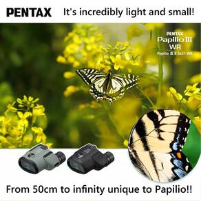 Pentax Papilio III 8.5x21 WR Preto, foco de 50 cm até o infinito, corpo resistente às intempéries, novo revestimento HD, ideal para observar objetos pequenos, para viagens, caminhadas, shows, esportes e observação de estrelas.