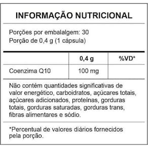 Ingredientes: Coenzima Q10 pó maltodextrina, goma arábica Acacia senegalL. , amido de milho Zea mays , azeite de oliva Olea europaea , ácido acético e ácido cítrico , agente de massa celulose microcristalina, antiumectantes dióxido de silício e estearato de magnésio, glaceante hidroxipropilmetilcelulose e corante dióxido de titânio.
