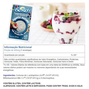 Bio Rich é isento de calorias, desta forma, o iogurte produzido conterá apenas os valores dos produtos que forem utilizados no preparo.