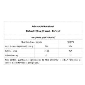 Biolugol 500mg 60 caps - Padrão: Único Biolugol 500mg 60 caps Biolugol da Bionutrir é um suplemento composto por alta concentração de iodo, iodeto e selênio. O iodo estimula o bom funcionamento da glândula da tireoide melhorando a produção de hormônios, os quais são fundamentais no metabolismo. Controla a síntese de estrogênio nos ovários. Também, o iodo ajuda na eliminação de substâncias tóxicas. Contudo, contribui para a saúde e manutenção da pele. benefícios: - Preveni problemas na tireoide;- Preveni a infertilidade em mulheres;- Alta concentração de iodo;- Ajuda no metabolismo energético;- Eliminação de substâncias tóxicas;- Saúde da pele. Marca: Não Informado