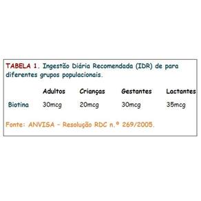 Um organismo nutricionalmente saudável precisa consumir diariamente micronutrientes como vitaminas e minerais. A quantidade ou IDR (Ingestão Diária Recomendada) pode variar conforme o grupo populacional dividido por idades ou condição especial como gestantes, mães que amamentam ou praticantes de atividade física. Para vitamina BIOTINA na Tabela 1, temos a ingestão diária recomendada para cada grupo específico