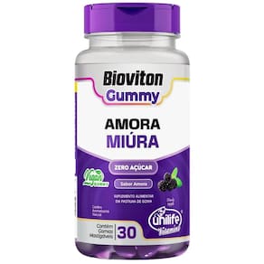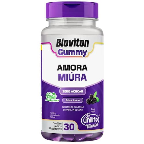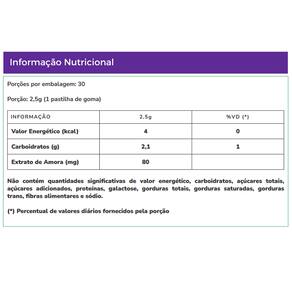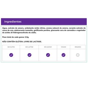 Ingredientes: Água, extrato de amora, acidulante ácido cítrico, aroma natural de amora, corante extrato de casca de uva, edulcorante isomalte, gelificante pectina, glaceante cera de carnaúba e regulador de acidez di-hidrogenocitrato de sódio.