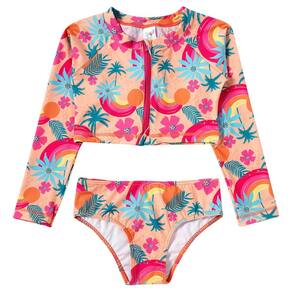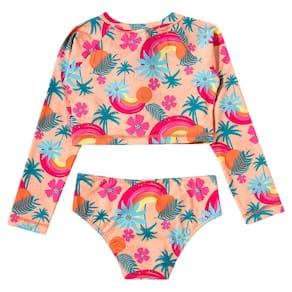Com proteção solar permanente (FPS 50+) design moderno e confecção em tecidos leves, o biquíni cropped manga longa com zíper frontal da coleção Tropical Tucando Laranja Claro da Tip Top possui modelagem moderna e ótimo caimento com máximo de conforto para as meninas.