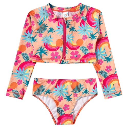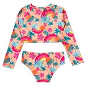 Com proteção solar permanente (FPS 50+) design moderno e confecção em tecidos leves, o biquíni cropped manga longa com zíper frontal da coleção Tropical Tucando Laranja Claro da Tip Top possui modelagem moderna e ótimo caimento com máximo de conforto para as meninas.