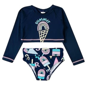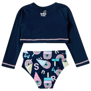 Com proteção solar permanente (FPS 50+) design moderno e confecção em tecidos leves, o biquíni cropped manga longa da coleção Sorvete Marinho da Tip Top possui modelagem moderna e ótimo caimento com máximo de conforto para as meninas. A calcinha pode ser usada com o cós aberto ou dobrado.