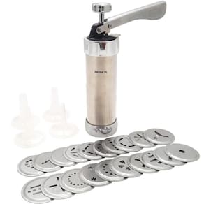 DescriçãoBiscoitinhos são bem-vindos em qualquer hora do dia, vai bem na hora do café, depois das refeições e para diminuir aquela fome repentina. A Máquina de Biscoito Manual Brinox Verona é puro charme, com seu design clássico e ótimo acabamento em inox, você pode preparar até 20 formatos diferentes de biscoitos e decorar com até 4 diferentes desenhos. Faça deliciosos biscoitos com gostinho caseiro e com os seus ingredientes preferidos e livres de conservantes. Contém:20 opções de moldes4 Bicos de decoraçãoMáquina de Biscoitos:Tamanho: 21 x 15,5 x 5,5cmComposição: Biscoiteira: Aço InoxMoldes: Alumínio