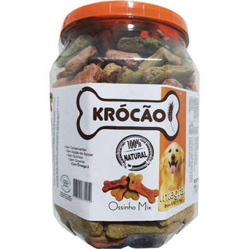 Biscoito integral para cachorro ossinho mix 800g krocão O biscoitos krocão são biscoitos integrais, 100% naturais e super premium para o seu pet. Elaborados pensando primeiramente na saúde do seu cão, os biscoitos krocão são livres de conservantes, corantes, açúcares, gordura animal e qualquer tipo de produto químico. Além de ser uma forma de agradar o seu cão, os biscoitos krocão trazem inúmeros benefícios para a saúde do seu pet, é uma alternativa saudável que também preza pelo sabor. Os biscoitos krocão são elaborados com leveduras protetores naturais do sistema imunológico , legumes desidratados ricos em vitaminas , farinhas integrais previne alergias e ômega 3. Dentre os benefícios que trazem para o seu cão estão: Melhora no sistema digestivo; Melhora no sistema imunológico; Pelos mais macios e com brilho; Redução de tártaros; Redução do mau hálito. Vitaminas a, e, b12 e zinco. Dica zenpet Os biscoitos krocão são snacks essenciais na hora do adestramento do seu cão. Na hora do reforço positivo não hesite em usar o que tem de melhor para o seu cãozinho. Além do aprendizado você proporciona agrado e saúde para o seu melhor amigo. Os biscoitos krocão são uma opção saudável e natural para esse momento Composição Amido de milho, extrato de levedura, farinha de trigo integral, farinha de arroz, farinha de milho, cenoura, beterraba, espinafre e tomate desidratado. Indicação de uso O biscoito natural krocão é indicado para agradar de forma nutritiva e saudável todos os tipos de cães, de todos os tamanhos e idade. Por conter ingredientes naturais e de qualidade, pode ser oferecido diariamente para o seu melhor amigo.