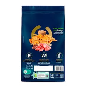 Farinha de trigo integral, farinha de trigo, farelo de trigo, grão de girassol, farinha de linhaça, gergelim preto, grão de quinoa, aveia, farinha integral de centeio, óleo de aves, proteína hidrolisada de frango, açúcar de cana-de-açúcar, parede celular de levedura, extrato de yucca 0,04% , hexametafosfato de sódio 0,1% , subproduto da extração da L-cistina, sulfato de condroitina 0,01% , cloreto de sódio, carbonato de cálcio, ácido propiônico, BHA Butilhidroxianisol e BHT Butilhidroxitolueno .