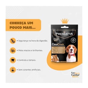 Biscoito Premiatta Cães ClassCrock - 400g - Indicado para cães; - Cães de todas as raças; - Proporciona pelagem macia e brilhante; - Auxilia no controle do tártaro; - Ajuda na digestão do pet; - Sem corantes artificiais. O Biscoito Premiatta ClassCrock é o petisco perfeito para seu pet, que com certeza deixará o dia de seu amiguinho mais feliz. Indicado para cães de todas as raças, o biscoito contém Ômegas 3 e 6 em sua composição, o que proporciona pelagem macia e brilhante para seu cão. O biscoito não possui corantes artificiais e ajuda na digestão do seu pet, pois contém probióticos em sua fórmula. Além disso, o biscoito auxilia no controle do tártaro nos dentes do cãozinho. Composição Carne bovina fresca, Carne mecanicamente separada, fígado de frango, proteína texturizada de soja, propileno glicol, cloreto de sódio (sal comum), farinha de vísceras, farinha de carne Hemácias, hexametafosfato de sódio, premix vitamínico mineral, dextrose, mannan-oligossacarídeos, aditivo antioxidante, sorbato de potássio, Aroma de frango.