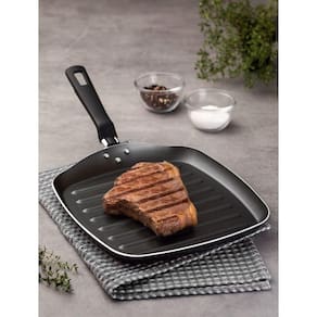 Bistequeira Tramontina Loreto em Alumínio com Revestimento Interno Antiaderente Starflon T1 e Cabo Baquelite 26 cm 1,0 L Grafite Quem adora preparar carnes precisa da Bistequeira Tramontina Loreto em Alumínio com Revestimento Interno Antiaderente Starflon T1 e Cabo Baquelite 24 cm 1,0 L Grafite. Perfeita para deixar filés, bifes, bistecas, carnes de frango, porco e peixe do jeitinho que você gosta, é produzida em alumínio com revestimento interno antiaderente Starflon T1, possui espessura que proporciona um cozimento rápido e uniforme dos alimentos, alto poder de antiaderência e ainda garante maior resistência à abrasão, prolongando sua vida útil em 5.000 ciclos. Para sua segurança, o cabo foi produzido em baquelite antitérmico, que evita queimaduras; um item resistente, durável e super fácil de limpar, que ainda poder ir à máquina de lavar de louças. Além disso, conta com sulcos que garantem uma marquinha suculenta a suas receitas! Informações Gerais Corpo de alumínio com espessura de 2,3 mm que proporciona cozimento rápido e uniforme. Revestimento interno e externo de antiaderente Starflon T1. O único com a tecnologia T: maior poder de antiaderência; maior resistência à abrasão; maior durabilidade; mais fácil para limpar e livre de PFOA, garantindo uma resistência à abrasão acima de 5.000 ciclos segundo a Norma ABNT NBR 15321:2013. Cabo de baquelite antitérmico que oferecem segurança durante o manuseio. Pode ir à máquina de lavar louças facilitando seu dia a dia.