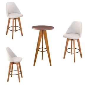 Bistrô Maya Com 3 Banquetas Assento Bege - Aurora Line Banqueta Maya Giratória com Mesa Bistrô - GAT MAGAZINE A Banqueta Maya possui assento e pés em madeira eucalipto com sistema giratório! Os pés contam com um reforço que proporciona um suporte de peso de até 120 Kgs.O assento é revestido com espuma D-23. Além de bonita e charmosa, vai trazer para seu ambiente elegância e proporcionará conforto para sua família e amigos nos momentos de lazer.
