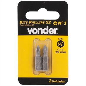 Bits/ponteira Phillips Vonder 1/4 N1 3/16 x 25mm Aço S2 com 2 peças - O bits/ponteira Phillips Vonder 1/4 N1 3/16 x 25mm Aço S2 com 2 peças é indicado para apertar e soltar parafusos com cabeça fenda cruzada phillips através de parafusadeiras e suportes manuais. Muito utilizado na área moveleira, automotiva, industrial, domicílios, entre outros. Fabricado em aço especial S2, que possui propriedades superiores em termos de resistência, aumentando a sua vida útil. Recebe ainda acabamento jateado, que proporciona ótima proteção contra oxidação. Facilita muito o trabalho de aperto e desaperto de parafusos, principalmente, quando utilizado em parafusadeiras. Características Gerais do Produto: Marca: Vonder Referência: 35.39.201.025 Número da Ponta: Nº 1 - 3/16 Comprimento Total: 25 mm Acabamento: Jateado Material: Aço S2 Especial Tipo de Encaixe: Sextavado - 1/4 6,35 mm Acompanha o produto: 02 Bits/Ponteiras Phillips Vonder 1/4 N1 3/16 x 25mm Aço S2 : 3 Meses Marca: Não Informado Ean: 7893946409500