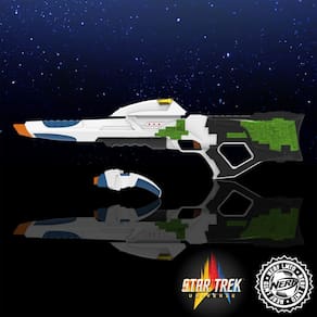 Lançador motorizado Nerf LMTD Star Trek Starfleet Type 3 Phaser com luzes e sons, Starfleet Type 2 Phaser, 7 Elite Darts - ENGAGE! COM O 35º ANIVERSÁRIO DE STAR TREK: THE NEXT GENERATION: esses 2 lançadores Nerf LMTD, inspirados nos Phasers Tipo 3 e Tipo 2 da Frota Estelar, capturam a aparência dos icônicos phasers do universo de Star Trek - PHASER TIPO 3 COM EFEITOS DE LUZ E SOM: as áreas iluminadas incluem efeitos de assimilação de Borg e efeitos de phaser. Inclui sons de filmes autênticos do filme Star Trek: First Contact e sons de ação phaser - O PHASER TIPO 3 POSSUI LANÇAMENTO DE DARDOS MOTORIZADO: Ligue o motor neste lançador automático de dardos Nerf e tente atacar os drones Borg. Dispara 5 dardos de espuma em uma fileira a partir do clipe interno de 5 dardos - TIPO 2 PHASER BLASTER: O phaser dispara 1 dardo e tem uma alça de escorvamento para trás. Coloque 1 dardo no lançador, aperte e pressione o botão para lançar o dardo — INCLUI 7 DARDOS NERF ELITE: este incrível conjunto de 2 phasers icônicos de Star Trek vem com 7 dardos oficiais de espuma Nerf Elite
