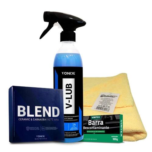 Blend pasta 100g + v-lub 500ml + barra descontaminante vintex + microfibra corte a laser s/ costura 330gsm Kit blend pasta 100g + v-lub 500ml + barra descontaminante 50g vintex + microfibra corte a laser Blend ceramic & carnaúba paste wax Cera em pasta com sio2 & carnaúba Blend ceramic & carnaúba paste wax é uma cera híbrida composta por sio2 e pela mais pura carnaúba tipo 1, protege a superfície veicular por até sete meses. O produto promove a resistência cerâmica, brilho quente da carnaúba e hidrorrepelência. Uso: Pintura, superfície cromada, black piano e rodas. Durabilidade Até sete meses de proteção na pintura do veículo. Rende até 25 aplicações Até 7 meses de durabilidade Brilho e hidrorrepelência -modo de uso 1- lavar bem o veículo e certificar-se que a pintura esteja livre de qualquer contaminante 2- aplicar o produto utilizando aplicador de espuma contido na tampa da embalagem, realizando movimentos uniformes sem deixar espaço sem aplicação 3- aguardar entre 5 e 10 minutos 4- remover cuidadosamente o produto utilizando toalha de microfibra de alta qualidade, observando o brilho desejado 5- uma segunda camada do produto proporcionará brilho e proteção ainda maior. V-lub Lubrificante para barra descontaminante V-lub é um lubrificante de pintura desenvolvido especialmente para utilização em conjunto com a v-bar vonixx ou barras descontaminantes em geral. V-lub contém agentes lubrificantes de última geração que reduzem o atrito da barra descontaminante, possibilitando suave deslize da v-bar na pintura e reduzindo chances de riscos, além de facilitar trabalho executado. Diluição Pronto uso. Modo de usar: 1.Realize a lavagem prévia do veículo; 2.Certifique-se de que a pintura esteja fria; 3.Modele uma pequena quantidade de v-bar, deixando uma parte entre os dedos e a maior parte na palma das mãos; 4.Pulverize uma pequena quantidade de v-lub sobre a superfície em áreas não superiores à 40cm x 40cm. 5.Utilizando o pedaço de v-bar já modelado, realize leves movimentos na horizontal, até sentir a superfície lisa e isenta de contaminantes; 6.Antes que seque, realize o acabamento utilizando toalha de microfibra limpa e seca até observar a pintura renovada, livre de asperezas e com excelente brilho; 7.Continue repetindo estes processos até a conclusão completa do veículo. Facilita a descontaminação Reduz o atrito Promove brilho Barra descontaminante vintex é um produto desenvolvido especialmente para remoção de contaminantes na pintura do veículo, como pulverização de tintas, seivas de árvores, fezes recentes de pássaros, impactos de insetos, poluição industrial, pó de freio, pigmentos de asfalto e resíduos diversos que danificam a pintura, deixando-a áspera e sem brilho. Modo de usar: 1.Realizar a lavagem prévia do veículo. Certificar-se de que a pintura esteja fria. 2.Modelar uma pequena quantidade do produto, de forma a deixar uma parte da barra descontaminante vintex entre os dedos indicador e anelar para melhor estabilidade durante o uso. 3.Pulverizar pequena quantidade de v-lub vonixx sobre a superfície em áreas não superiores à 40cm x 40cm. 4.Utilizando o pedaço de barra descontaminante vintex já modelado, realizar leves movimentos horizontais até sentir a superfície lisa e livre de contaminantes. pano de microfibra sem costura corte a laser 330gsm Indicada para limpeza de superfícies, remoção de ceras e para acabamento final do polimento. Reutilizável, retém a poeira sem riscar a superfície. Um lado é felpudo para limpezas mais delicadas e o outro é mais raso, recomendado para vidros. Medidas: 37x57cm Material: 80% poliéster 20% poliamida