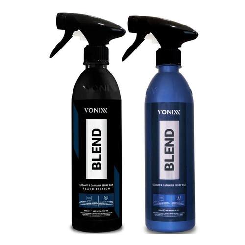 Blend spray 500ml + blend black spray 500ml Kit blend spray 500ml + blend black spray 500ml Blend ceramic & carnaúba spray wax Cera líquida com sio2 e carnaúba Blend ceramic & carnaúba spray wax é uma cera híbrida, composta por sio e pela mais pura carnaúba tipo 1 e que protege a superfície Veicular por até quatro meses. O produto promove a resistência cerâmica, brilho quente da carnaúba e hidrorrepelência. -diluição Pronto uso. -pode ser usada em pintura fosca, vitrificada ou envelopada. Não recomendamos o uso do produto em plásticos. -caracteristicas -contém sio2 -mantém o brilho da pintura -até 4 meses de durabilidade -modo de usar: 1- agite bem o produto antes de usar. 2- após lavar o veículo, pulverize uma pequena quantidade do produto na pintura. 3- mantenha uma distancia de 20 cm em uma área não superior à 60 cm x 60 cm. 4- sem deixar secar, realize o acabamento utilizando toalha de microfibra limpa e seca, até obter o brilho desejado. 5- continue fazendo o processo até a conclusão total do veículo. --obs: em caso de manchas, aplicar novamente o produto. Blend ceramic & carnaúba spray wax black edition Blend ceramic & carnaúba spray wax black edition é uma cera híbrida, composta por sio2 e pela mais pura carnaúba tipo 1 que protege a superfície veicular por até quatro meses, em especial as pinturas escuras. O produto promove a resistência cerâmica, brilho quente da carnaúba e hidrorrepelência. -diluição Pronto uso. -informações adicionais Não utilizar o produto em plásticos. -caracteristicas -infusão de sio2 e carnaúba -proteção de até 4 meses -modo de uso: 1- agitar bem o produto antes de usar. 2- após lavar o veículo, pulverizar uma pequena quantidade do produto na pintura, mantendo distância de 20cm e em área não superior à 60cm x 60cm. 3- sem deixar secar, realizar o acabamento utilizando toalha de microfibra limpa e seca, até obter o brilho desejado. 4- repetir o processo até a conclusão total do veículo. Em caso de manchas, aplicar novamente o produto.