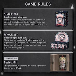 - Design aleatório: as caixas cegas são totalmente aleatórias e não podemos aceitar solicitações de itens específicos. As chances de obter a edição secreta geralmente são 1/144. Ao comprar o conjunto completo, não haverá figuras duplicadas.
