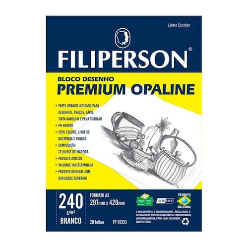 Bloco a3 premium branco 240grs c/20 folhas filiperson 01393 O bloco escolar premium opaline é ideal para atividades escolares, artísticas e trabalhos manuais. O papel branco liso e gramatura de 240g/m, oferece excelente rigidez e acabamento. Sua superfície uniforme garante cores mais vivas e definição ao desenhar, pintar ou imprimir. É perfeito para uso em escolas, escritórios, gráficas e projetos criativos.