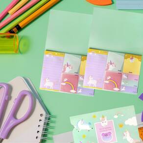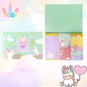 Quantidade: contém 6 blocos adesivos. Número de folhas: cada bloco possui 50 folhas. Gramatura do papel: 70g/m, garantindo qualidade e durabilidade. Design: estampa de unicórnio feliz, colorido e atraente. Formato: ideal para anotações, lembretes e organização.