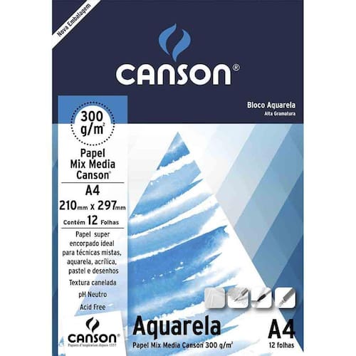 Bloco Aquarela A4 300g 12 Folhas - Canson Aquarela Mix Media , É Um Papel Artístico, Dupla-Face De Alta Gramatura E Com Dupla Face De Utilização Texturizada E Lisa. É Um Dos Papéis Artísticos Com A Melhor Relação Custo E Benefício Do Mercado, Além De Oferecer Um Ótimo Resultado Tem Um Alto Nível De Consevação . Especialmente Indicado Para Aquarela, Tinta Acrílica E Também Para Técnicas Secas Como Giz Pastel , Giz Oleoso E Lápis De Cor. Fabricado Na França. Fibra: 100% Fibras De Madeira. Brancura: Natural Sem Alvejante Ótico. Ph: Neutro, Ou Seja, Igual A 7 Para Evitar O Amarelamento. Textura: Delicadamente Canelada Para Realçar Os Efeitos De Luz Da Aquarela. Também Pode Ser Utilizada Para Desenho Com Giz Pastel E Tinta Acrílica. Cor: Branco.