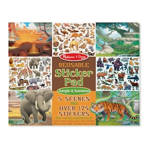 Bloco de atividades com adesivos, reutilizável, Melissa & Doug - Bloco de atividade adesivo extragrande com tema de animal selvagem/selva e safári - Inclui 5 fundos coloridos e 175 adesivos reposicionáveis em estilo aderente - Cenas de fundo removíveis incluem savana africana, selva asiática, sertão australiano, selva amazônica, congo africano - Promove habilidades motoras finas e brincadeiras criativas - A partir de 3 anos de idade - AVISO: Perigo de asfixia - Peças pequenas. Não adequado para crianças menores de 3 anos.