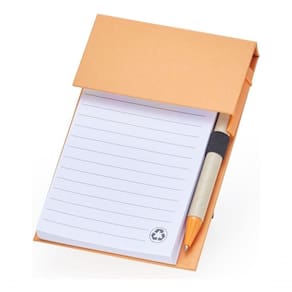 Bloco de anotações ecológico com caneta, feito em kraft com 6 blocos autoadesivos coloridos com aproximadamente 20 folhas e bloco com aproximadamente 100 folhas brancas com pauta. Possui porta caneta elástico e acompanha caneta de papelão e detalhes plásticos, carga esferográfica azul e acionamento por clique.