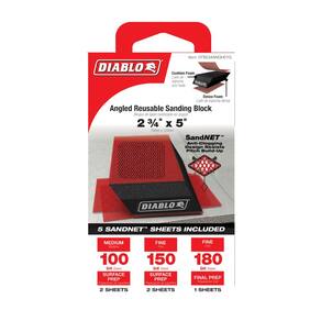 The Diablo Angled Foam Sanding Block is ideal for precision sanding in tight spaces and on detailed surfaces. This sanding block is designed to deliver smooth, even finishes on wood, metal, and plastic. Its angled shape allows easy access to corners and edges, while the foam provides consistent pressure for uniform sanding. Package includes includes (5) SandNET sheets: (2) 80-Grit for Coarse/Removal, (2) 120-Grit for Medium/Surface Prep and (1) 220-Grit for Ultra Fine/Finish. These versatile sheets cover a wide range of sanding needs, providing durability and efficiency for any project, whether you're removing tough material, prepping surfaces, or achieving a smooth, professional finish. Reusable and washable, this sanding block is ideal for both dry and wet applications, making it a versatile tool for any sanding project.