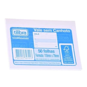 O Bloco de Vale sem Canhoto Tilibra Vale Sem Canhoto 50 Folhas é ideal para registrar e organizar transações financeiras do dia a dia. Com 50 folhas, oferece quantidade adequada para controle contínuo de registros. O formato de 110mm x 79mm e a gramatura de 56 g/m proporcionam escrita confortável e manuseio prático. Pode ser utilizado em comércios, escritórios e demais ambientes que necessitam de controle de vales. A Tilibra é reconhecida no segmento de papelaria, oferecendo produtos certificados FSC.