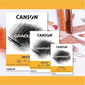 Os blocos Canson Graduate Bristol possuem um papel extra branco de 180 g/m² e uma superfície muito lisa. São ideais para desenhos de precisão a lápis ou com marcadores graças a superfície resistente do papel. Técnicas recomendadas: Lápis, marcador fino ou qualquer técnica que requer uma superfície lisa e traços fáceis, como hiper realismo.