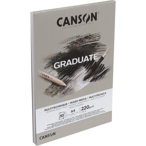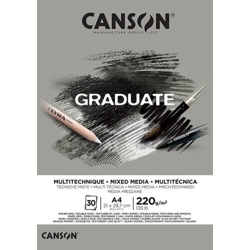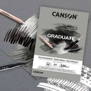 Os blocos Canson® Graduate Mixed Media Gris/Cinza possuem um papel de cor cinza, resistente e com dupla textura (fina e lisa). Graças às suas características, são ideais para sobressair as cores e criar profundidades nas obras: juntar branco ou preto, intensificar facilmente as sombras e os contrastes. São compostos por 30 folhas de papel de 220 g/m². São ideais para misturar técnicas e obter ótimos resultados. Técnicas recomendadas: técnicas mistas (lápis, aquarela, tinta acrílica, marcadores, etc..) Também recomendamos o uso de carvão, pastel e ou giz branco para criar volume.