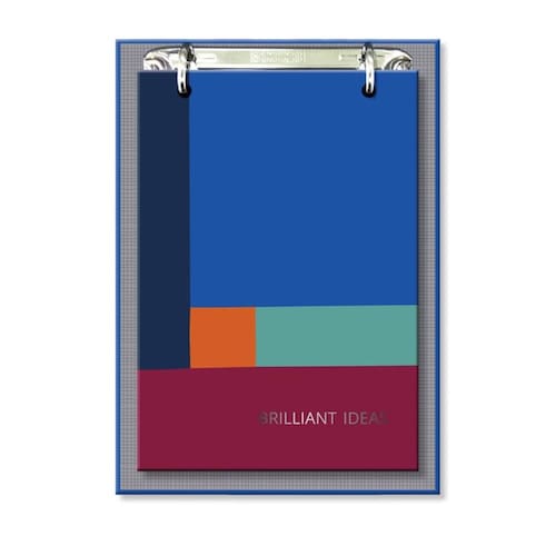Bloco office com ferragem, capa dura, miolo blocado com serrilha com 150 folhas brancas, papel off set 75g, formato 12 cm x 18 cm.