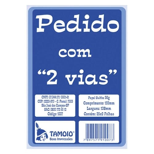 - Marca: Tamoio - Pedido 1/36; - Contém: 01 Bloco - Contém: 25x2 Folhas; - Com 50 folhas cada - Formato: 155 x 108mm - Modelo: 1007 - Tamanho: Pequeno - Papel Sulfite - Gramatura: 56g - Pedido sem cópia 2 via - Sem canhoto Marca: Não Informado