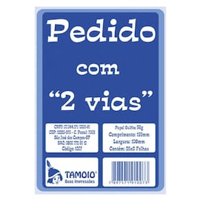 - Marca: Tamoio - Pedido 1/36; - Contém: 01 Bloco - Contém: 25x2 Folhas; - Com 50 folhas cada - Formato: 155 x 108mm - Modelo: 1007 - Tamanho: Pequeno - Papel Sulfite - Gramatura: 56g - Pedido sem cópia 2 via - Sem canhoto Marca: Não Informado Ean: 7897571910073