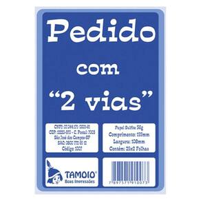 - Marca: Tamoio - Pedido 1/36; - Contém: 01 Bloco - Contém: 25x2 Folhas; - Com 50 folhas cada - Formato: 155 x 108mm - Modelo: 1007 - Tamanho: Pequeno - Papel Sulfite - Gramatura: 56g - Pedido sem cópia 2 via - Sem canhoto Marca: Não Informado