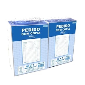 O pedido com 2 vias 40x2 para anotação de pedidos e encomendas em diversos estabelecimentos afins de transações comerciais. Possui 2 vias sendo a primeira via pautada em azul e a segunda via sem pauta. Pacote com 20 unidades. Detalhes:fabricante: são domingosformato: 104 mm x 143 mmfolhas internas: papel offset gramatura: 56 g/mquantidade de folhas: contém 40 folhas pautadas e 40 folhas sem pauta.Quantidade de vias: 2 vias br - contém 20 unidadesbr - 80 folhas no total -imagens meramente ilustrativas br atenção: a cor do produto pode variar de acordo com o monitoratenção: o fabricante pode alterar embalagem ou a cor de alguma parte do produto sem aviso prévio Marca: Sao Domingos - Impressos Ean: 17891321100438