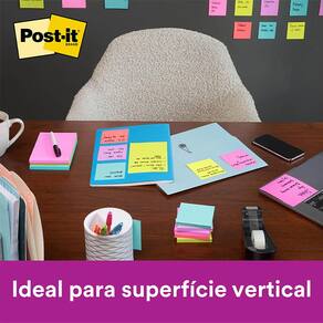 Suas folhas são reposicionáveis, ou seja, possuem Super Adesivo Post-it, que permite que sejam retirados e recolocados, sem danificar papéis ou outras superfícies, sem deixar resíduos do adesivo e sem perder a eficiência na fixação. Sua embalagem é transparente e permite que você visualize a cor real do produto, além de protegê-lo, fazendo com que chegue sem nenhuma sujeira ou mancha em suas mãos. Tenha os blocos de notas adesivas Post-it sempre à mão em seu escritório ou em casa, dentro de seu caderno, da bolsa, próximo ao telefone, cabeceira da cama ou onde mais quiser.