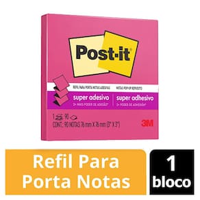 O Bloco Adesivo Amarelo Post it foi inventado por um pesquisador da 3M em 1980 e, desde então, conquistou o mundo! A inovação não parou por aí e outros tamanhos, formatos e cores vieram para facilitar ainda mais o nosso dia a dia. O Refil do bloco adesivo Post it da 3M, é especialmente produzido para ser utilizado nos Suportes Post it e tem um formato que lembra uma sanfona. Esse formato especial permite que ao puxar uma folha adesiva, você sempre tenha outra sempre à mão, retirando uma folha por vez de forma fácil e prática. Suas folhas são reposicionáveis, ou seja, possuem adesivo de qualidade 3M, que permite que sejam retirados e recolocados, sem danificar papéis ou outras superfícies, sem deixar resíduos do adesivo e sem perder a eficiência na fixação. Traga mais cor ao seu dia a dia e personalize sua mesa de trabalho ou anotações com blocos adesivos na cor rosa neon. Você anota todos os seus compromissos e lembretes, classificando-os por cor. São 90 folhas adesivas por bloco. Possui 2x mais adesão do que o bloco autêntico Post it amarelo. Post it é perfeito para levar para qualquer lugar e chamar a atenção para as atividades na área de trabalho, na escola ou em casa.