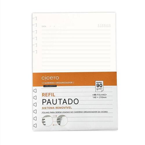 Refil Caderno Organizador 40 folhas Pautado A5 é produto refil do mais novo lançamento premium da Cicero: o caderno organizador com novo sistema removível. Para usar nesse produto com a furação especial tipo taça, esse miolo permite ser organizado do seu jeito. São folhas que podem ser retiradas e levadas para um curso, uma reunião, e depois colocadas novamente em seu caderno.