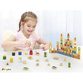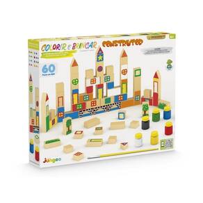 Construtor Colorir e Brincar da Junges com 60 peças em madeira de reflorestamento (MDF). Acompanha 6 tintas temperas e 1 pincel para os pequenos artistas se divertirem muito!