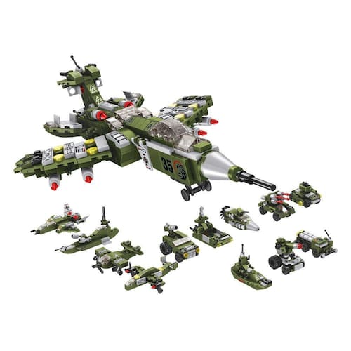 São mais de 500 peças para montar 24 diferentes tipos de veículos de ataque ou montar um incrível e poderoso Avião de Combate!