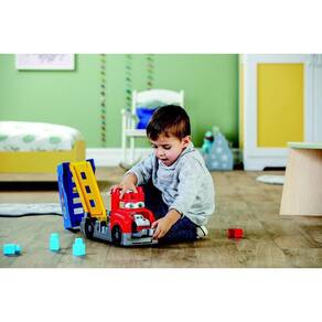 Reconfigure a grande plataforma e use o corpo do caminhão como base para os blocos de construção e as pistas de corrida incluídos. Organize a rampa de maneiras diferentes para construir todos os tipos de acrobacias de corrida.