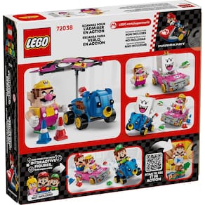 Pilote, faça drifts, voe e batalhe com este conjunto de veículo LEGO Super Mario: Mario Kart – Wario e Rei Bu (72038) para crianças Uma ideia de presente de personagens da Nintendo empolgante para meninos, meninas e gamers maiores de 8 anos, o conjunto inclui duas figuras LEGO Super Mario, modelos construídos com peças dos veículos icônicos Carango e Ursinho, além de dois cones de trânsito Cada kart conta com uma função de disparo de cascos e ação de drift, e o Carango possui um planador destacável que também cabe no Ursinho Coloque uma figura de LEGO Mario, LEGO Luigi ou LEGO Peach (dos conjuntos 71439, 71440, 71441 ou 72043, vendidos separadamente) em qualquer um dos karts para brincadeiras interativas, acionando efeitos sonoros/visuais de buzinas, drifts e voos de Mario Kart