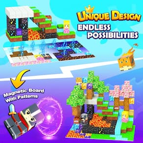- Quadro magnético para construções maiores: Maximize o jogo e expanda as construções! Este conjunto inclui um quadro magnético de dupla face com designs de grama e minerais, dando às crianças uma base estável para estruturas maiores e mais complexas. O design inteligente permite que cada peça vá mais longe, aumentando as possibilidades de construção, expandindo o jogo criativo e minimizando a bagunça. Crie mais, construa maior!