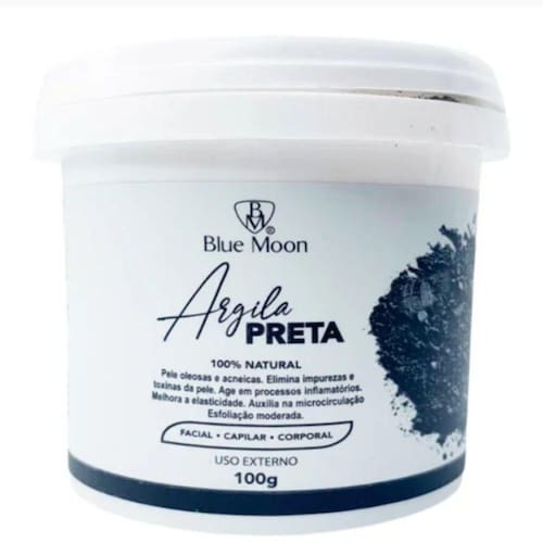 Blue Moon Argila Preta 100% Natural 100g Blue Moon Argila 100% Natural 100g - Um presente da natureza para a sua pele! Renove sua beleza natural com a Blue Moon Argila 100% Natural, disponível em uma incrível variedade de cores: Cinza, Preta, Verde, Branca, Rosa e Dourada. Cada variação oferece benefícios exclusivos para a sua pele, proporcionando um cuidado completo e luxuoso. Argila Cinza: Purificante e revitalizante, ideal para controlar a oleosidade e minimizar poros. Argila Preta: Detox profundo para eliminar impurezas e promover uma pele radiante. Argila Verde: Poderosa para equilibrar a pele mista e oleosa, reduzindo acne e inflamações. Argila Branca: Suave e suavizante, perfeita para peles sensíveis, restaurando a luminosidade. Argila Rosa: Nutritiva e regeneradora, trazendo um brilho natural à sua pele. Argila Dourada: Iluminação e firmeza para um visual mais jovem e radiante. Nossa argila é extraída cuidadosamente da natureza e é livre de aditivos químicos, garantindo a pureza e eficácia que sua pele merece. Experimente a Blue Moon Argila 100% Natural e descubra o segredo de uma pele saudável e radiante, de forma completamente natural. Seu ritual de beleza está prestes a se tornar ainda mais especial!