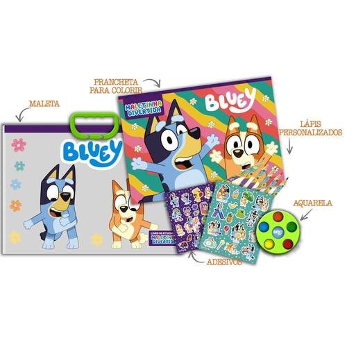Oi, amigos! Vamos nos divertir com a "Bluey Maleta Divertida"! Esta maleta incrível vem com tudo que vocês precisam para soltar a criatividade! Dentro, vocês vão encontrar 6 lápis coloridos, aquarela para fazer pinturas lindas e adesivos fofinhos da Bluey e seus amigos. É perfeita para desenhar, colorir e brincar! Preparem-se para muitas aventuras artísticas! Vamos criar juntos!