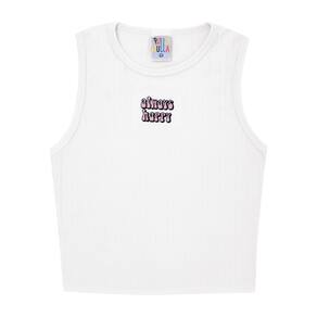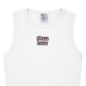 As meninas vão poder sentir a liberdade e o conforto dos dias quentes do verão! Confeccionada em tecido malha canelada na cor branca, a blusa no modelo regatinha possuí aplique bordado com escrita "Always happy" na parte frontal da peça. Elas podem combinar entre si no look e arrasrem nas brincadeiras. *Tradução "Sempre feliz"