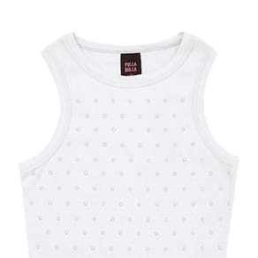 Fresquinha, confortável e fashion esta peça não pode faltar no guarda-roupa das meninas! Confeccionada em ribana com elastano leve, a blusa na cor branca e no modelo regata possuí apliques metalizados na parte frontal da peça. Que tal uma voltinha com a melhor amiga?